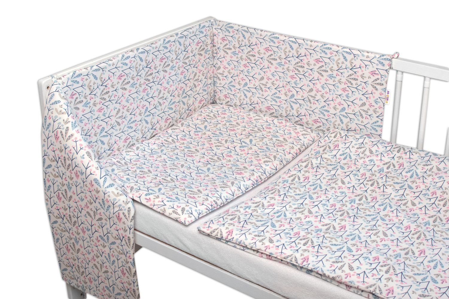Materiál: Obliečky – 100% bavlna. Mantinel: Vrchná časť 100% bavlna, výplň duté vlákno – hypoalergénne.