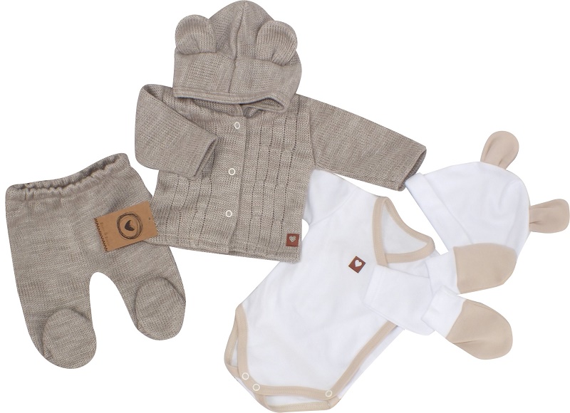 Materiál: body, čiapočka a rukavičky – 100% bavlna, polodupačky a svetrík – 100% Akryl.