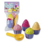 9dielna sada tvorítok na piesok – tortičky. Vyrobené z kvalitných plastov v Taliansku. Obsahuje: Lopatku na zmrzlinu a 8 tvorítok na tortičky.