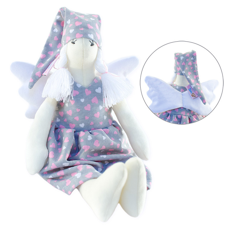 Anjelik je z príjemného a mäkkého materiálu s výraznou čiapočkou a nočnou košieľkou.