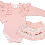 BABY NELLYS 2-dielna sada, body dl.rukáv +suknička s krajkou a volánikmi, veľ. 98, pudrová