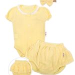 Baby Nellys 3-dielna mušelínová súpravička, body, kraťasky+čelenka GIRL, žltá, veľ. 74