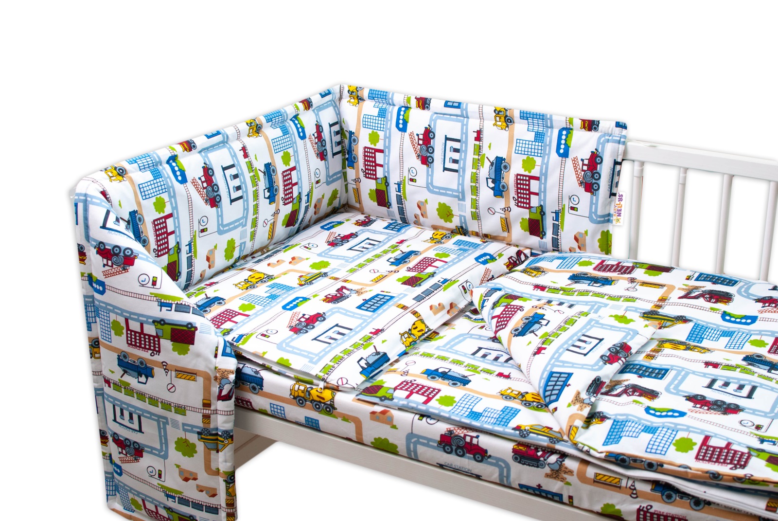 Baby Nellys 3-dielna sada Mantinel s obliečkami – Stavebné stroje, biela