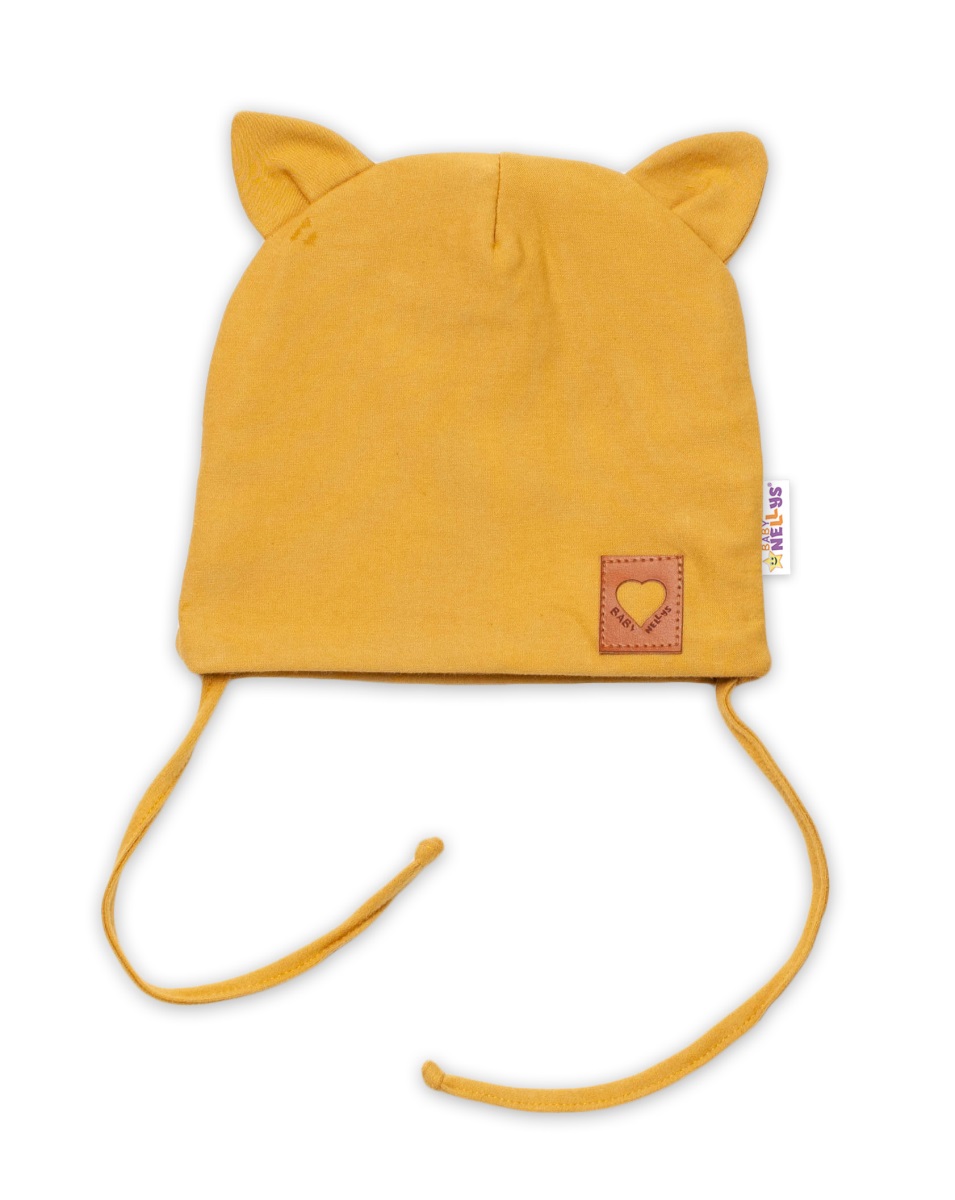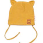 Baby Nellys Bavlnená dvojvrstvová čiapka s uškami na zaväzov. FOX- horčicová, veľ. 80/86