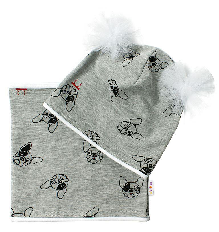Baby Nellys Bavlnená sada čiapočka s tutu a nákrčník Psíci – šedá, ekri vel. 110