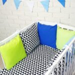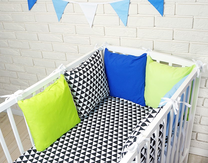 Baby Nellys Vankúšikový mantinel s obliečkami – trojúholníky, čierna/modrá/zelená