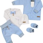 Bavlnená sada, body, nohavice, motýlik a čiapka Elegant Boy 5D, Kazum, modrá/biela, veľ.74