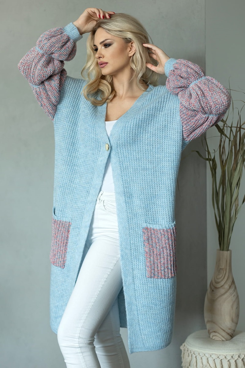 Dlhé naberané rukávy, voľný dlhý strih, mäkký a nadýchaný kardigán, zapínanie na gombík.