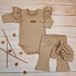 Body s volánikmi, legíny do zvonu a čiapočka, 3D, bavlna, cappuccino, veľ. 86