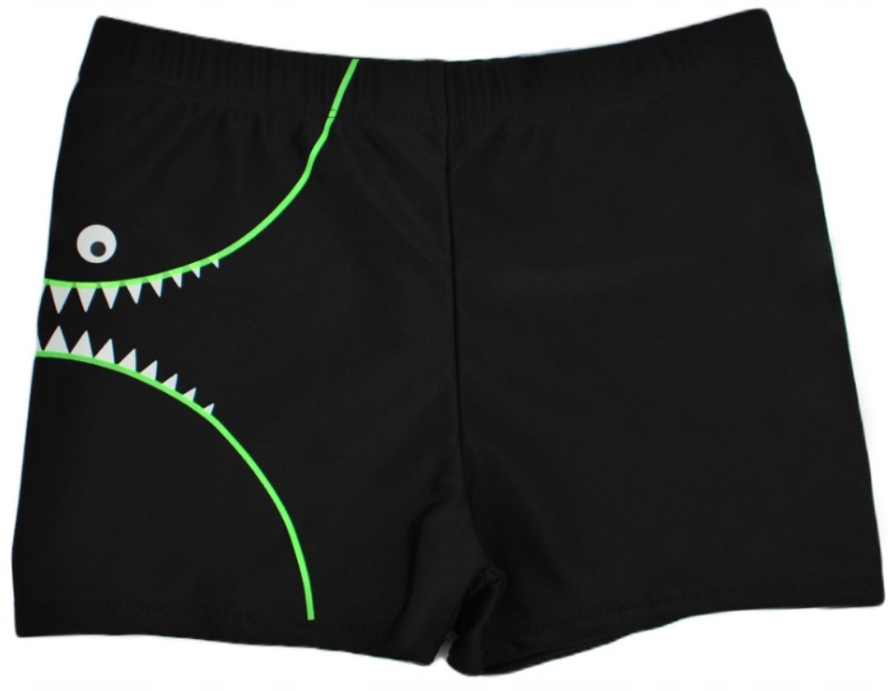 Chlapčenské čierne plavky s potlačou žraloka na boku. Vďaka sťahovaciemu pásu a regulácii pomocou šnúrky sa dajú individuálne prispôsobiť postave. Vnútri šortiek je vpredu všitý ďalší jemný materiál, ktorý zabraňuje oderom kože.