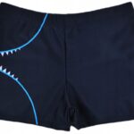 Chlapčenské námornícke modré plavky s potlačou žraloka na boku. Vďaka sťahovaciemu pásu a regulácii pomocou šnúrky sa dajú individuálne prispôsobiť postave. Vnútri šortiek je vpredu všitý ďalší jemný materiál, ktorý zabraňuje oderom kože.