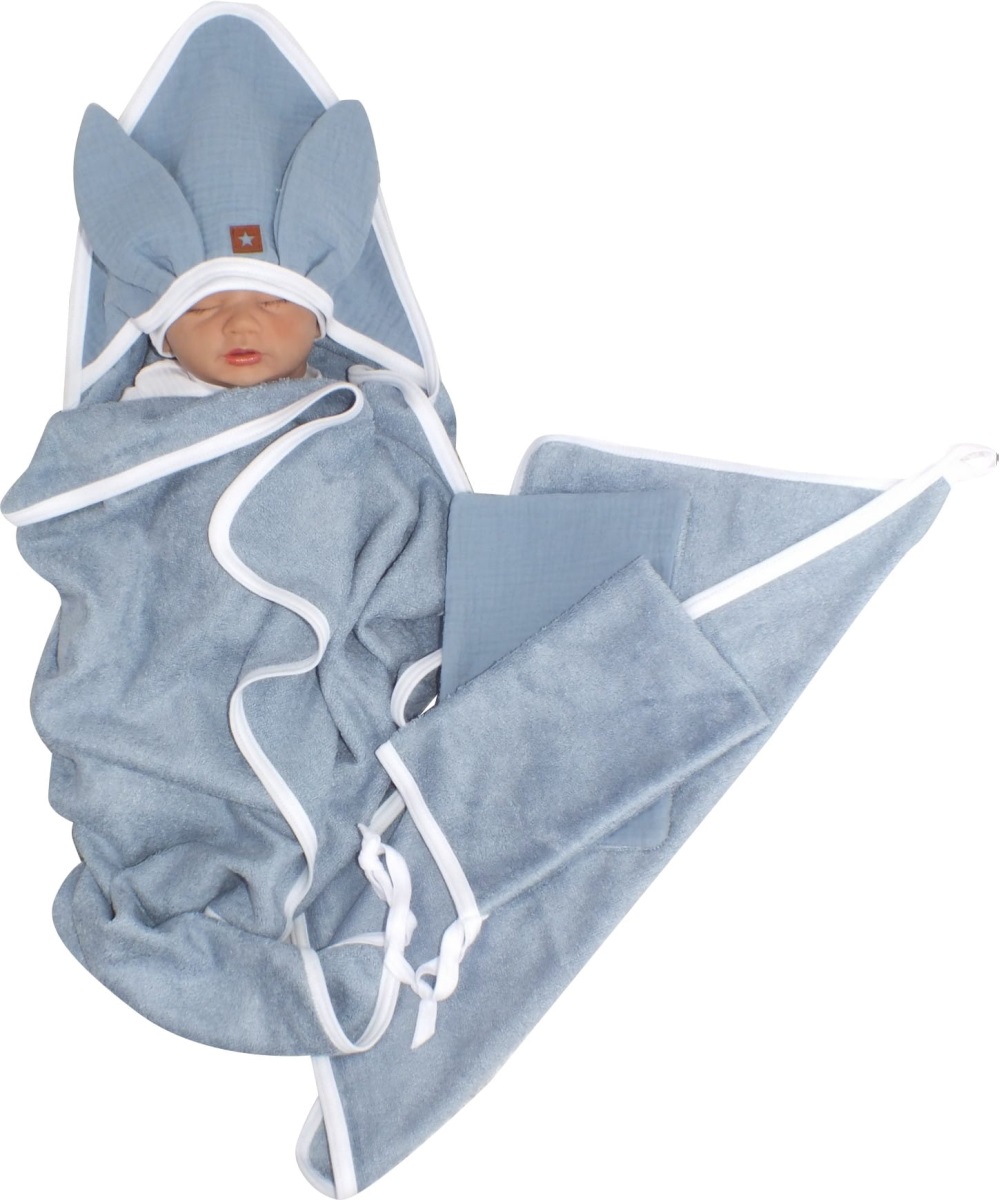 Detská luxusná 4D bambusová sada – osuška s kapucňou a uterákom + 2 žinky, modrá