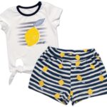 Biele tričko s krátkym rukávom, zdobené citrónovou potlačou av spodnej časti blúzky je malý výrez so šnúrkami na zaväzovanie, ktoré podčiarkujú jej prázdninovú atmosféru. Navyše je na ramene košele umiestnený patentný gombík, ktorý uľahčuje obliekanie. Šortky sú potiahnuté prúžkami a citrónmi, majú módne volány a dve vrecká na bokoch.