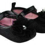 Dojčenské capáčky/topánočky s kvietkom, brokát/čierne, Baby Nellys, vel. 6/12 m
