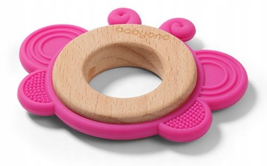 Drevené, silikónové hryzátko BabyOno – Motýlik, ružové