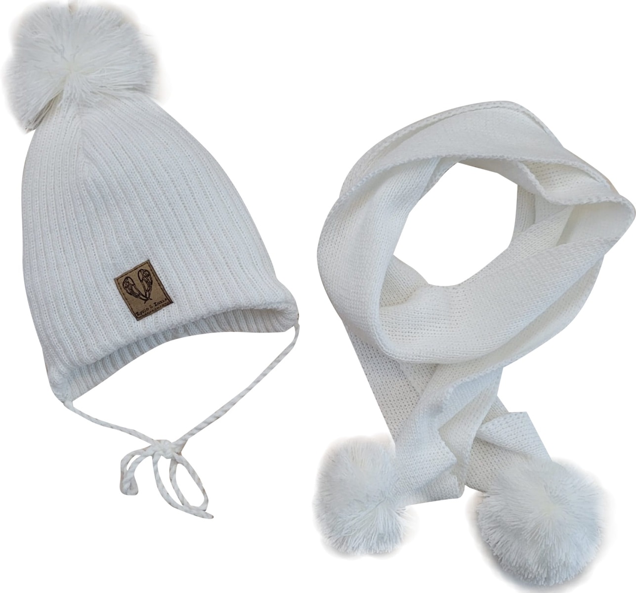 Dvojvrstvová pletená čiapočka na zaväzovanie + šál s brmbolcami, biela, veľ. 80/86
