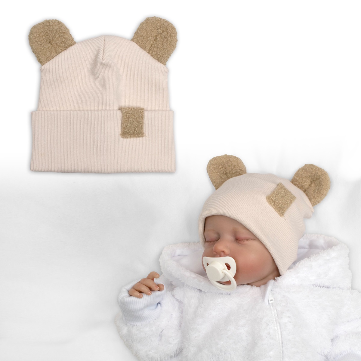 Dvojvrstvová rebrovaná čiapočka s uškami boucle medvedík – béžová, 68/74