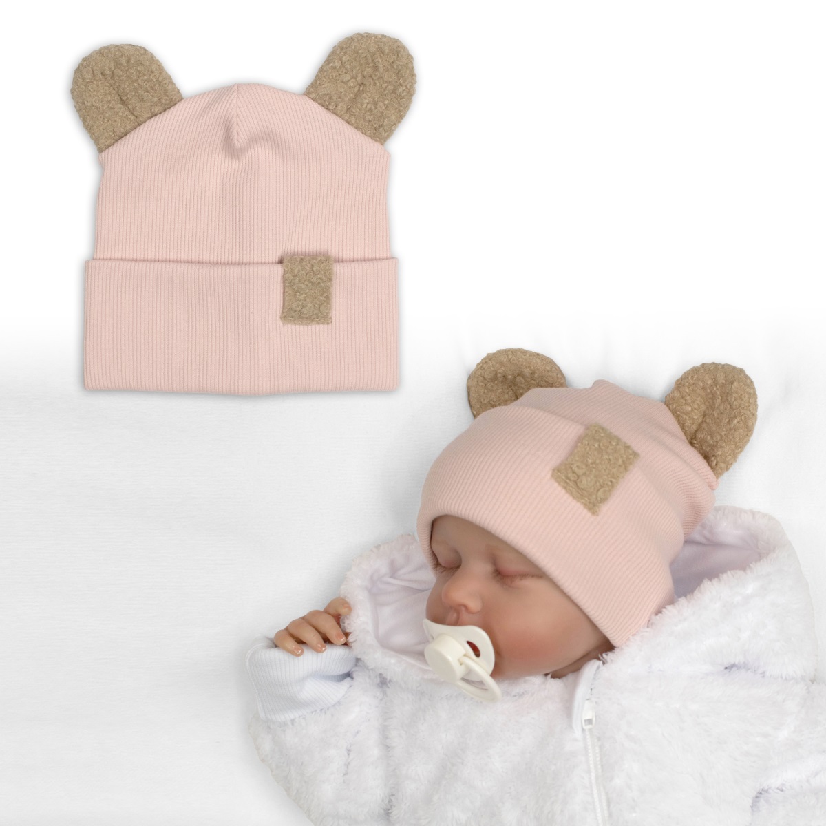 Dvojvrstvová rebrovaná čiapočka s uškami boucle medvedík – ružová, 68/74