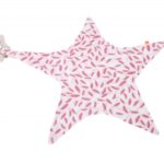 Jemná textilná hračka s odnímateľným hryzátkom v tvare hviezdičky, vyrobená z prírodného kaučuku.