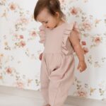 Letný mušelínový overálok pre dievčatká s volánikom Star – béžový, vel. 104
