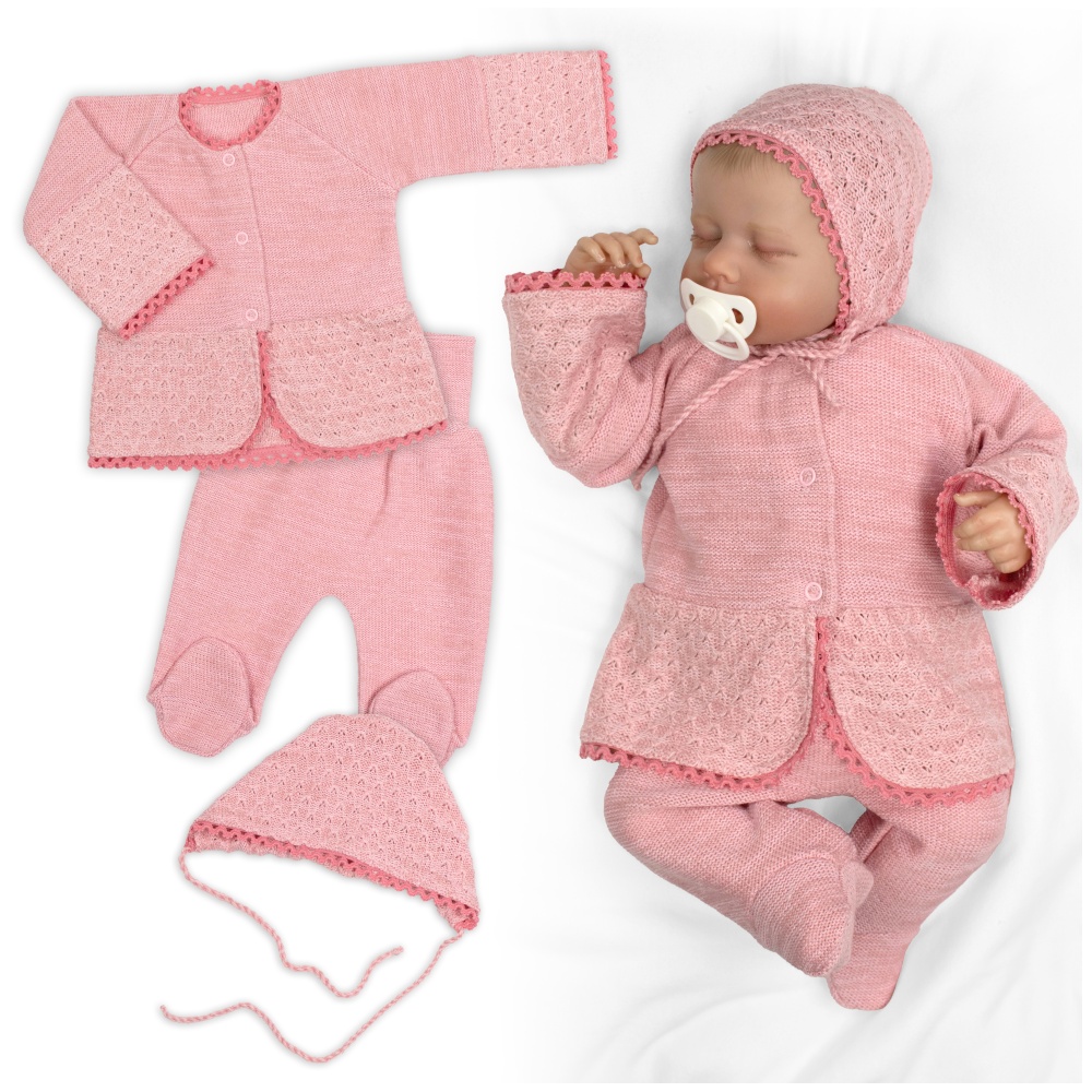 Luxusná pletená sada, kabátik, polodupačky a čiapky, 3D – púdrovo růžová, veľ. 62