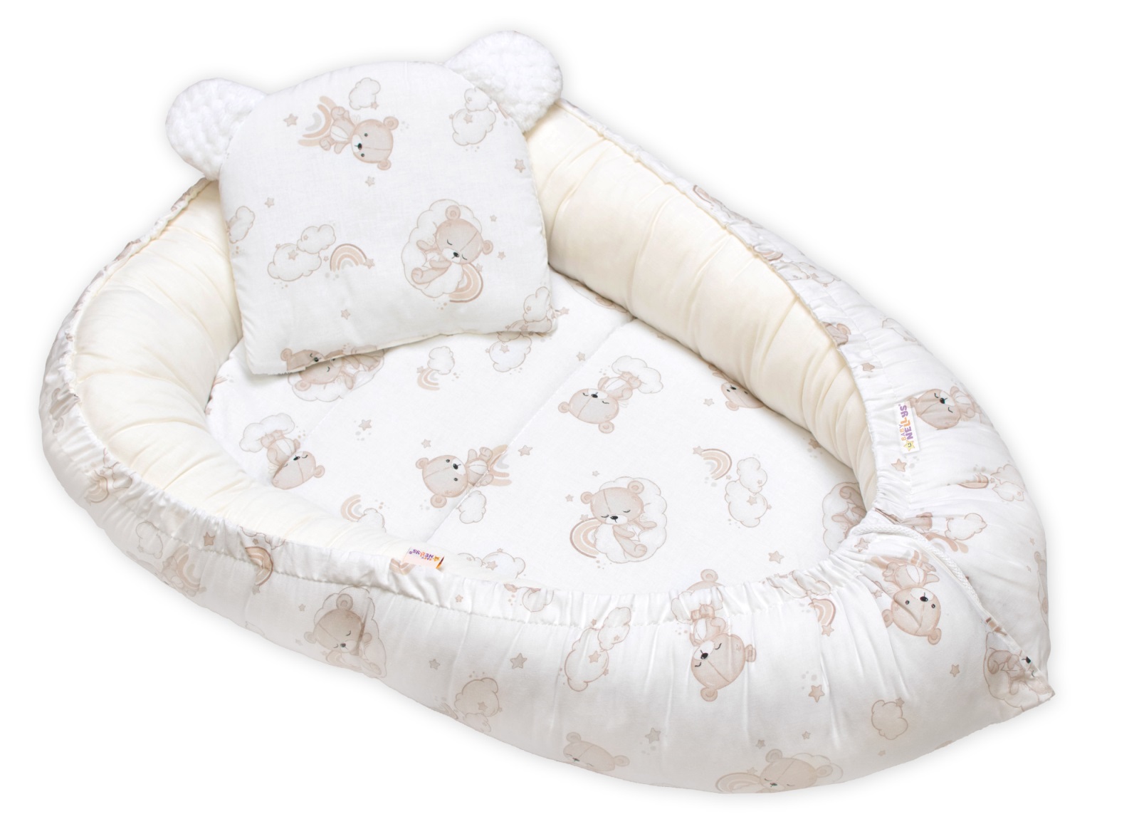 Obojstranné hniezdočko, podložka + vankúšik 3D, Bavlna, Malý medvedík, biele