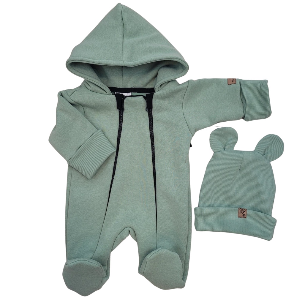 Oteplený detský overal so šľapkami a kapucňou + čiapočka, 2D, zelená, 68