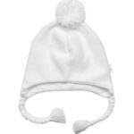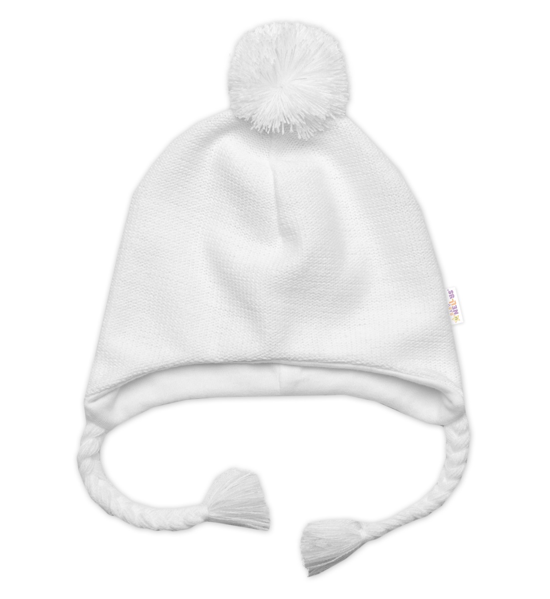 Pletená čiapka s bavlnenou podšívkou, brmbolcom a vrkôčiky, biela, veľ. 68/74