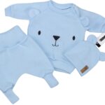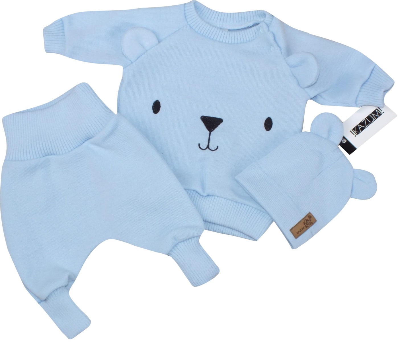 Pletená dojčenská sada 3D Medvedík, svetrík, tepláčiky + čiapočka Kazum, modrá, veľ. 62