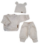 Táto oversize detská súprava je dokonalou kombináciou štýlu a pohodlia pre vašich najmenších. Skladá sa zo super módneho oversize svetra zapínaného pri krku, nohavíc, ktoré zaistia pohodlie a voľnosť pohybu po celý deň, a očarujúce čiapky s ušami.