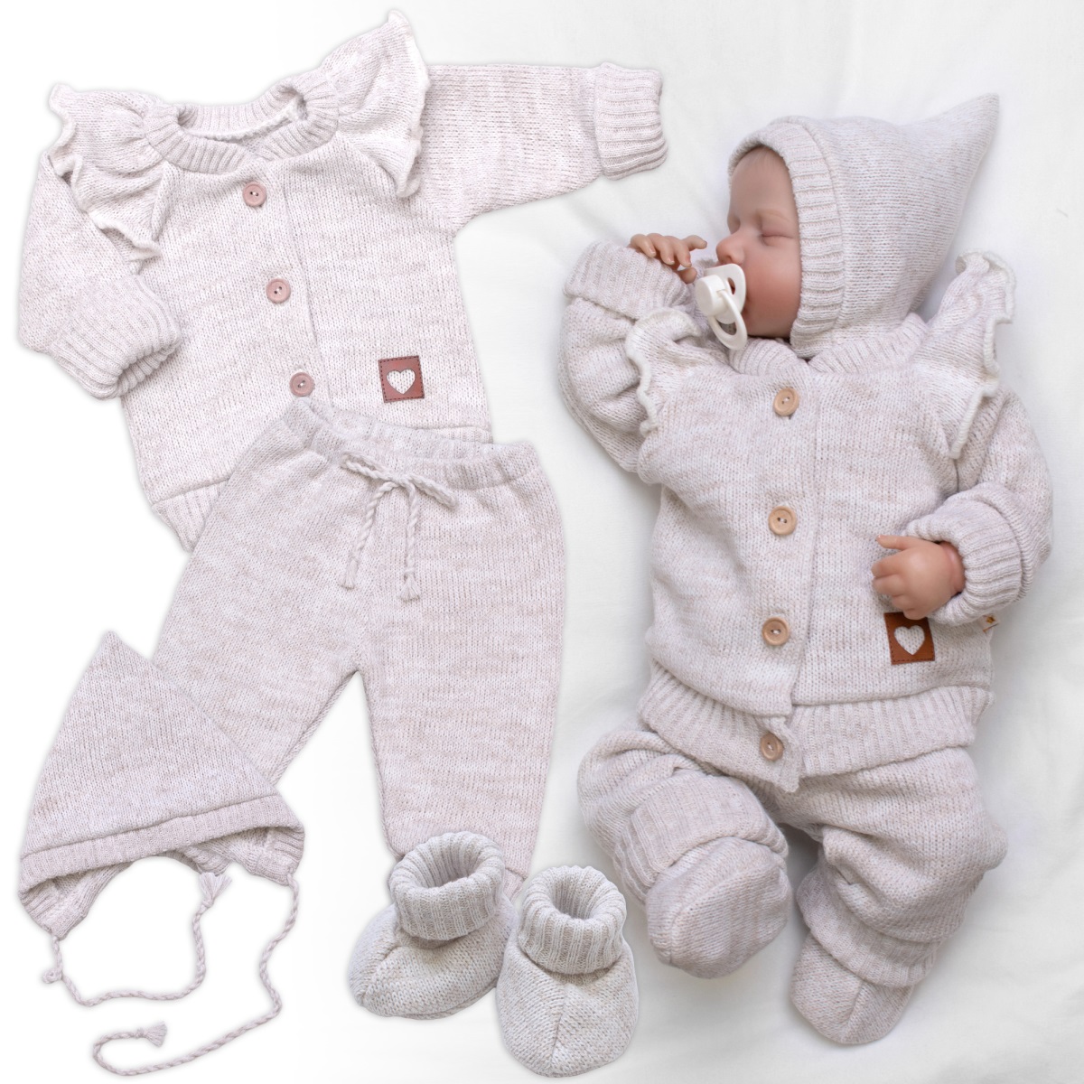 Táto luxusná 4D sada, pletený svetrík, nohavice, čiapočka a topánočky Hand Made 4D, je presne to, čo vaše bábätko potrebuje pre dokonalé pohodlie a štýl.