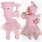 Sada obsahuje: polodupačky so šifónovou sukničkou, body s dlhým rukávom a ozdobnými volánikmi a čiapočku uzlík.