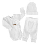 Rebrované zavinovacie body, tepláčky a čiapočka Kazum 3D bavlnená sada, biele, veľ. 62