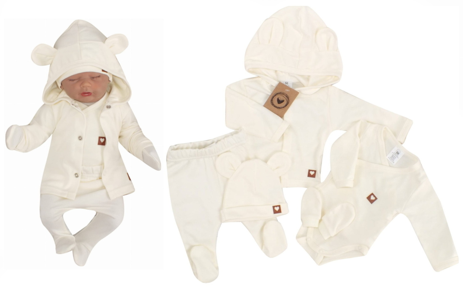Sada do pôrodnice 5D, body, polodupačky, kabátik, čiapočka, rukavičky – ecru, veľ. 62