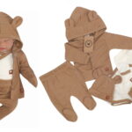 Sada do pôrodnice 5D, body, polodupačky, kabátik, čiapočka, rukavičky – hnedá, veľ. 62
