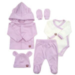 Sada do pôrodnice 5D, body, polodupačky, kabátik, čiapočka, rukavičky, lila
