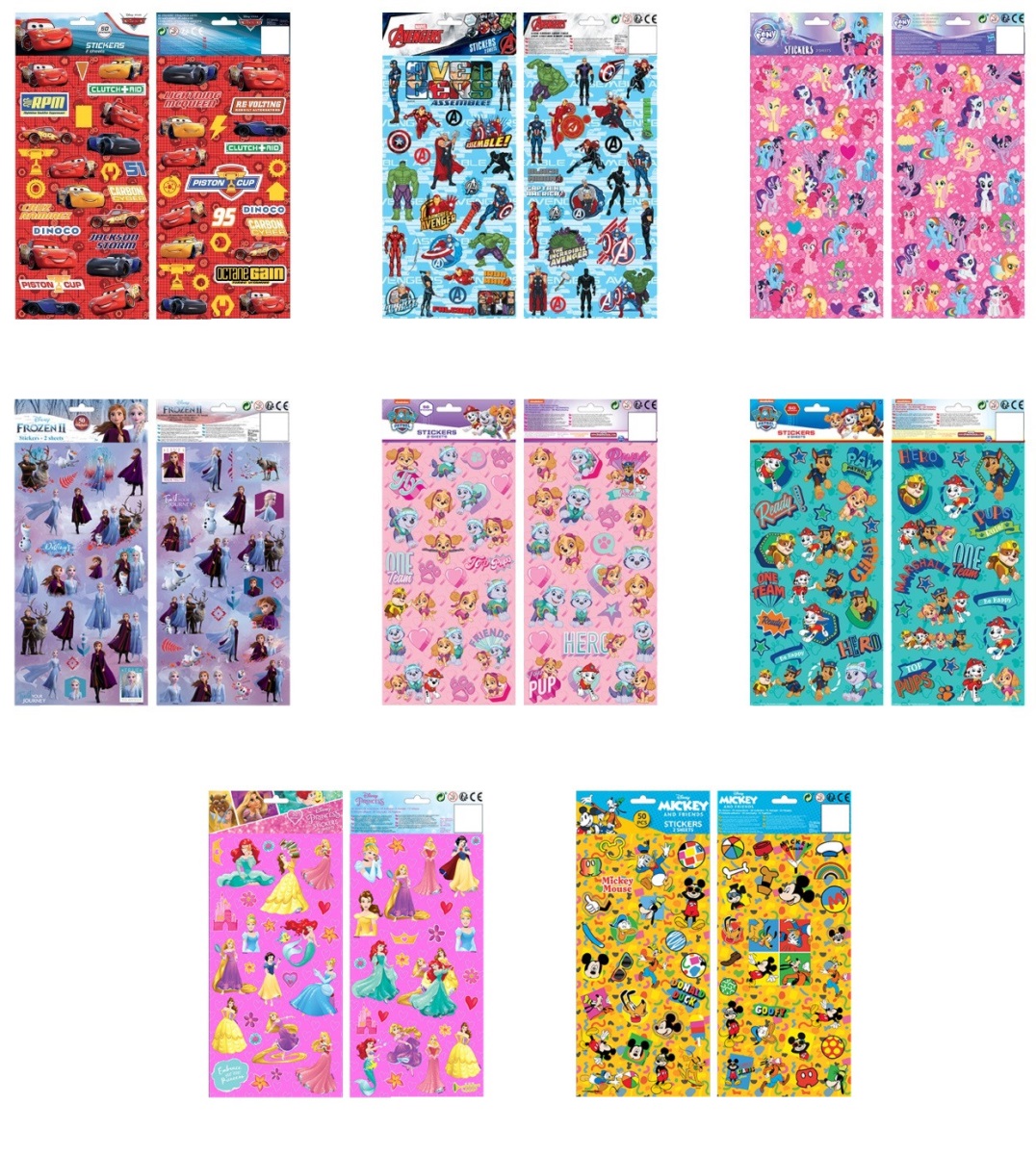 Samolepky 2 listy 15,5 x 35,5 cm 8 druhov (The Cars, Avengers, My Little Pony, Frozen 2, Paw Patrol, Princezné, Mickey). Nie je možné zvoliť druh, dodávame podľa skladovej dostupnosti.