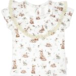 Módne tričko s krátkym rukávom, vyrobená z bavlny s potlačou. Potlač zobrazuje zajačikmi v odtieňoch hnedej medzi jemnou lúkou. Materiál je certifikovaný Oeko-Tex Standard 100. Dizajn zdobí nariasený volán na prednej strane zakončený bavlnenou čipkou. Vzadu na blúzke je zapínanie na slzu, ktoré výrazne uľahčuje obliekanie. Zapínanie na patentky bez obsahu niklu.