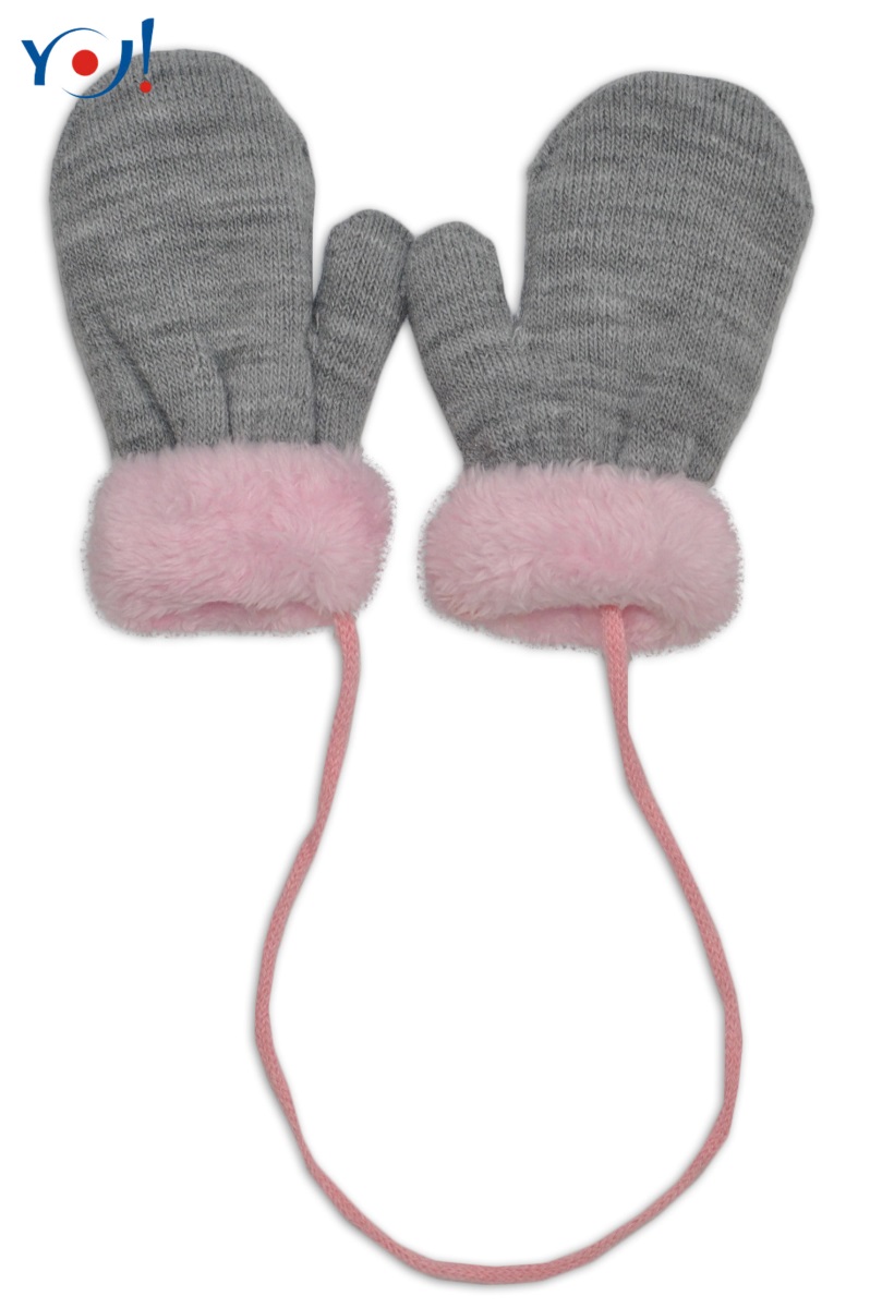 YO! Zimné detské rukavice s kožušinou – šnúrkou YO – sivá/ružová kožušina, 98/104