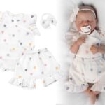 Mušelínové zavinovacie body zdobené volánikmi + kraťasky + čelenka.
