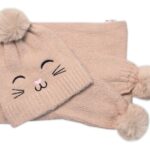 Zimná čiapka s brmbolcom + šál, Kitty, Baby Nellys – cappuccino, veľ. 54/58