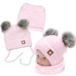 Zimná pletená čiapka Star s fleecom a chlpáčkové brmbolce + komínček 2D sada, ružová