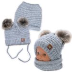 Zimná pletená čiapka Star s fleecom a chlpáčkové brmbolce + komínček 2D sada, sivý melírok