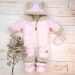 Zimná kombinéza s ozdobným béžovým medvedíkom.