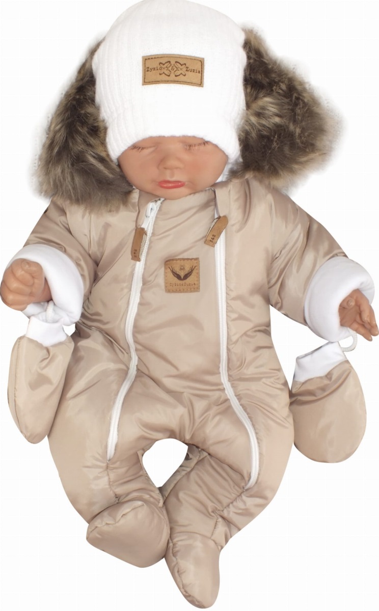 Z&Z Zimná kombinéza s dvojitým zipsom, kapucňou a kožušinou + rukavičky, Angel – béžový